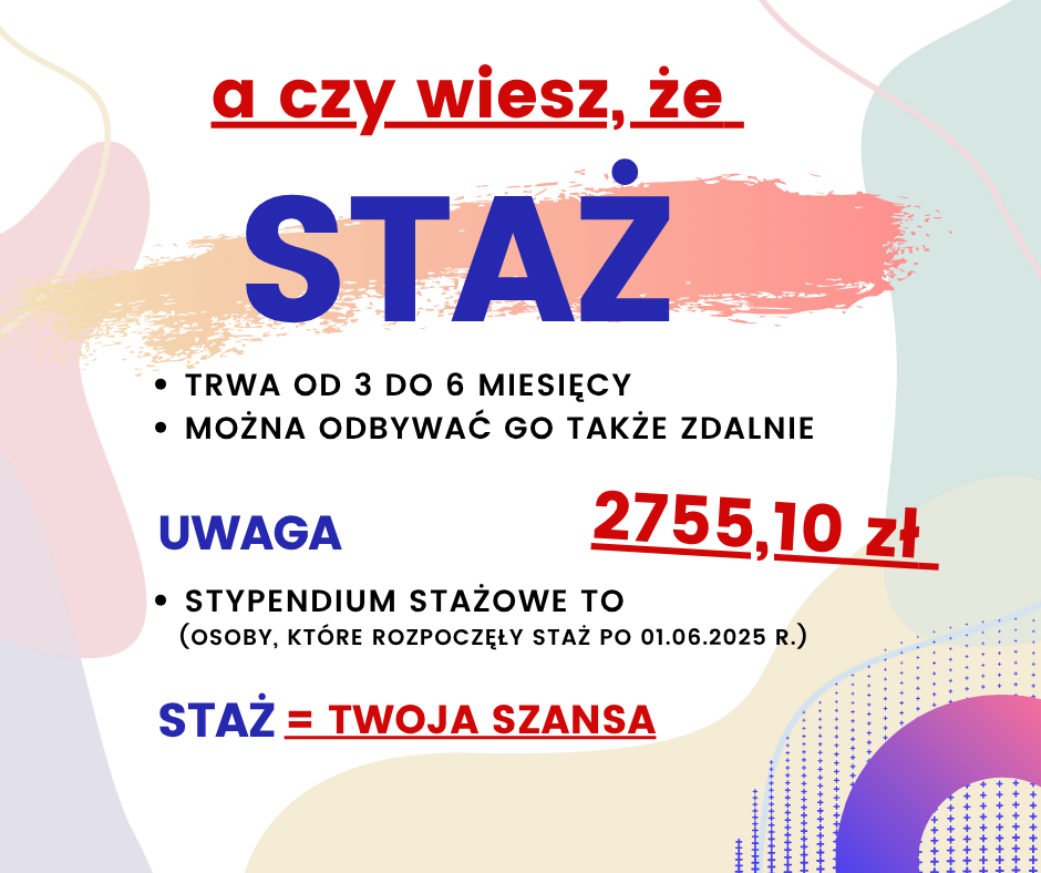Stypendium stażowe wynosi 2755,10 zł (dla osób, które rozpoczęły staż od 01.06.2025 r., kwota brutto).